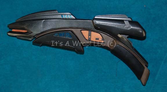 A prop item featured in various incarnations and in various episodes of Star Trek: Deep Space Nine. This item is a solid cast resin prop Romulan disruptor rifle painted metallic-pewter featuring black, metallic-copper, and green accents. The sides of the prop feature green painted ‘Romulan' character letters and the item … |