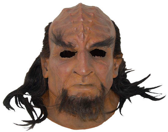 This incredible full head Klingon mask was used in Star Trek VI: Undiscovered Country, during a courtroom scene that involved around 200 Klingons. In order to dress that many actors in Klingon makeup, the background actors in the upper balconies wore these full faced masks to make the process quicker … |
