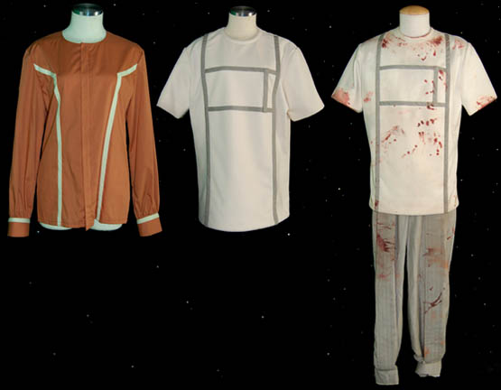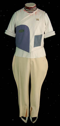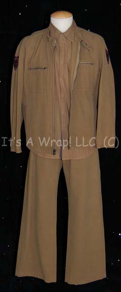 A costume featured in Star Trek I: The Motion Picture. A tan, Class-A, collared, long-sleeved, uniform shirt with threads from where the Starfleet insignia and division stripes were removed, unattached bio-monitor, and corresponding tan trousers. |