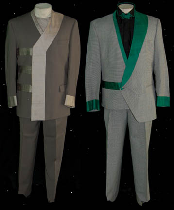 A trio of jumpsuit costumes featured in various episodes of Star Trek: Deep Space Nine for wear by Cirroc Lofton in his role as “Jake Sisko”. The costumes are a three colored green themed jumpsuit, a caramel colored one with a brown chest and back, and a tan one with … |