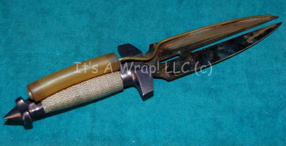 A prop knife featured in tenth Star Trek X feature film, “Nemesis”, for use by Tom Hardy in his portrayal of “Shinzon” during a scene taking place aboard the Reman Warbird “Scimitar” wherein he cuts his hand to allow for the “Enterprise-E” crew to take a sample of his blood … |