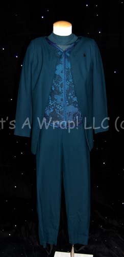 A costume featured in various episodes of Star Trek: Deep Space Nine for wear by Penny Johnson in the role of “Kasidy Yates”. The costume is long-sleeved, full-length teal, jumpsuit with velvet inset down the middle, a v-neck collar, a zip up the back, a matching belt, and stirrups for … |
