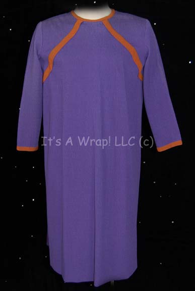A Bajoran themed surgical gown featured variously in episodes of Star Trek: Deep Space Nine. The item is colored purple, made from textured fabric with gold colored stripes. It is open down the back with multiple string ties and comes with a costumer’s tag reading ‘Bajoran Surgical Gown’. |