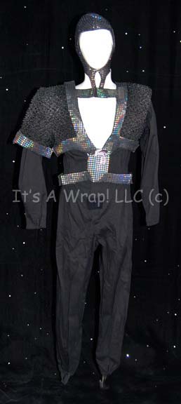 A costume featured in the Star Trek: Deep Space Nine episode “Rules of Acquisition”; wherein “Quark” (Armin Shimerman) is ordered by the Grand Nagus to open up the first trade negotiations with a Gamma Quadrant species, the “Dosi”. This costume consists of long-sleeved, full-length, black jumpsuit that is open halfway … |