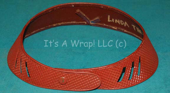 A Bajoran military officer’s belt like those appearing frequently in episodes of Star Trek: Deep Space Nine. The item is rust colored texture patterned vinyl with shaped trim, cut out hashes, and size adjustable snap positions for closure. Two snaps exist for an inch size difference. When the belt is … |
