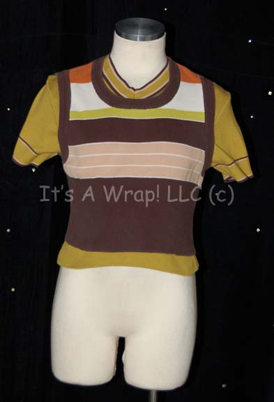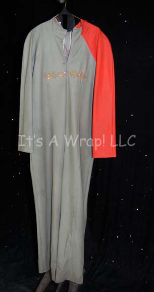 A costume featured in various episodes of Star Trek: Deep Space Nine beginning with the premiere “Emissary”. This costume consists of a sleeveless, olive-green jumpsuit with a Velcro strip on the abdomen, a yellow-green, long-sleeved, mid-riff shirt in the Ferengi style with a metallic design of irregularly shaped spots in … |