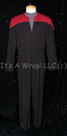 A costume featured in various episodes of Star Trek: Voyager for wear by Tarik Ergin in his portrayal of “Lieutenant Ayala”. This costume consists of a black jumpsuit with Command red division colors around the shoulders, sewn in ‘away team’ gear loops at the waist, an elastic waist with an … |