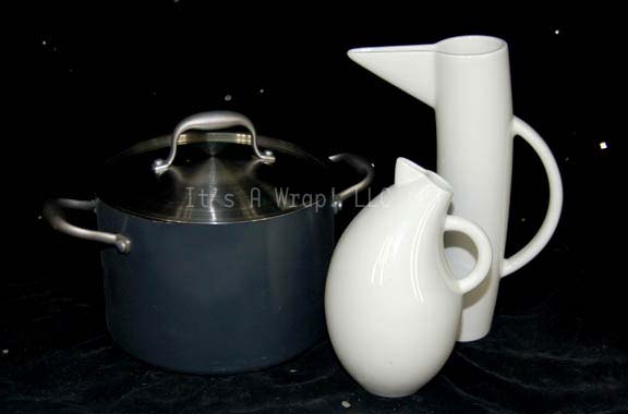 A pair of pitchers and a metal cooking pot appearing as set dressing in the Star Trek: Voyager episode “Human Error”. The items appeared on the set of “Seven of Nine’s” (Jeri Ryan) holographic quarters while she investigated her humanity. The items are a pair of white ceramic pitchers made … |