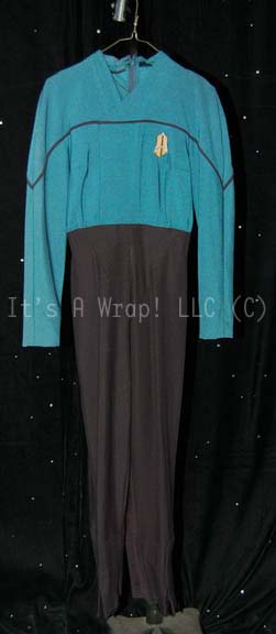 A costume featured in the finale episode of Star Trek: Voyager “Endgame”. This costume is the future-style Starfleet uniform and was worn at the tenth-anniversary party sequence earlier in the first part of the episode, it consists of a long-sleeved, full-length, Sciences Blue jumpsuit featuring a false, wrap-around front, black … |