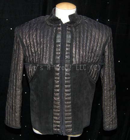 A costume element featured in the Star Trek: Voyager episode “Resistance”. This costume element consists of a long-sleeved jacket featuring black, quilted vinyl along the surface of most of the garment in an intentionally “wrinkled” texture, black suede portions on the front and back in addition to suede piping. A … |