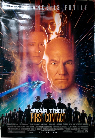 (1) Poster for Star Trek: Nemesis Encounter At Romulus, 24" x 36", with an inscription to make-up artist Michael Westmore from John Eaves, designer of starships, space stations and more for numerous Star Trek productions (2) two 40" x 27" posters for Star Trek: First Contact, both signed in black … |
