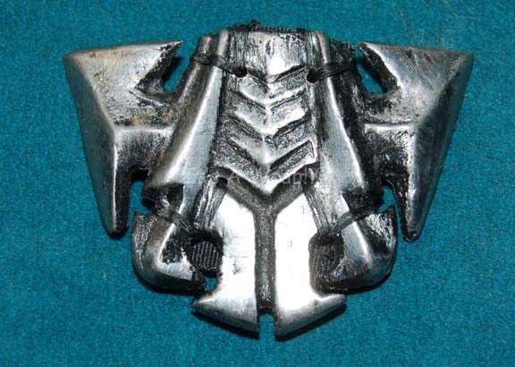 A metal Klingon costume badge like those appearing variously in Star Trek episodic television and feature films. The item is silver colored molded metal with a Velcro placement on the reverse. Items like this appeared in multiples on the costume of “Azetbur” (Rosanna De Soto) in Star Trek VI: The … |