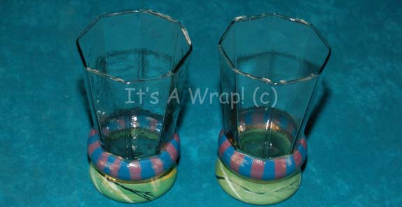 A pair of similar drinking glasses appearing variously in Star Trek episodic television. The items are thick glass with multiple multi-colored spots generally placed around the outside of the items. They measure approx. 5 X 3 inches diameter. |