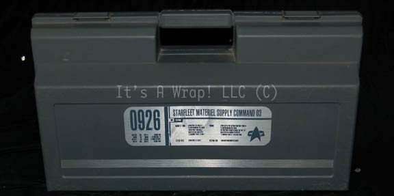 A prop Starfleet carry case like those appearing in various episodes of Star Trek: Voyager like “The Omega Directive”. The item is an injection molded plastic carry case with a molded handle, a hinged lid, flip-latches and adorned on both sides with a Starfleet inventory application. The application on the … |