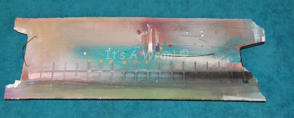A piece of abstract modern art created with a medium of stoneware clay with airbrushed acrylic paint while utilizing wire accents. Wall artwork like this appeared frequently in episodes of Star Trek: The Next Generation and Star Trek: Voyager in crew quarters as set dressing artwork. The item is made … |