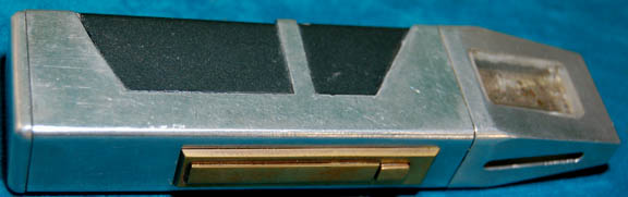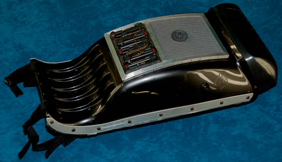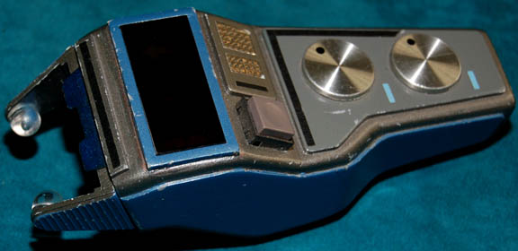 A Starfleet medical scanner used as set dressing in the Star Trek: Voyager episode “Shattered”. Made of resin painted gun-metal gray and blue, the scanner has metal disks and silver, black and blue applications applied for detail. A button on the front activates green sequentially lit lights on the front … |