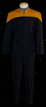 A costume similar to those featured throughout Star Trek: Voyager. This costume a long-sleeved, full-length black jumpsuit featuring Command Red division colors around the shoulders, hoops at the waist for tools, a Velcro patch for a commbadge (not included), stirrups for the feet, and a long-sleeved, blue/gray undershirt. A sewn … |