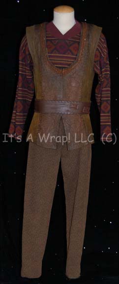 A costume featured in the Star Trek: Voyager episode “Repression”; wherein “Commander Tuvok” (Tim Russ) investigates recent murders of former Maquis on board. This costume consists of a long-sleeved, green shirt featuring a reflective, vertical dash and circular pattern, beige trousers with diamond shaped cuffs and a brown sleeveless robe … |