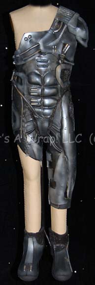 A costume duplicate for a stunt double or stand in featured in the Star Trek: Voyager episode "Collective"; wherein “Voyager” finds a Borg cube controlled by children who have been separated from the Collective. This costume has black and grey molded-rubber, “circuitry” and accents sewn onto an overall-style jumpsuit that … |