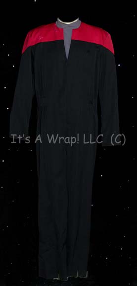 A costume featured in various episodes of Star Trek: Voyager. This lot consists of a long-sleeved, black, Starfleet uniform jacket featuring Command Red division colors, is open down the front; included is a resin-cast commbadge with Velcro backing, and a long-sleeved, blue/gray undershirt sewn onto the black uniform trousers making … |
