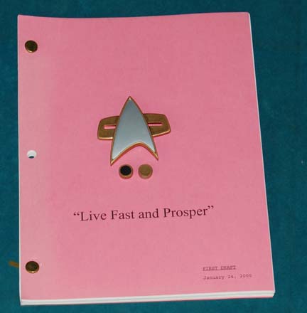 A lot of a script a props from the Star Trek: Voyager episode “Live Fast and Prosper”; wherein the "Voyager" crew find that a trio of con artists are impersonating "Captain Janeway (Kate Mulgrew), "Tuvok" (Tim Russ), and “Chakotay" (Robert Beltran) offering membership into "The Federation" in exchange for whatever … |