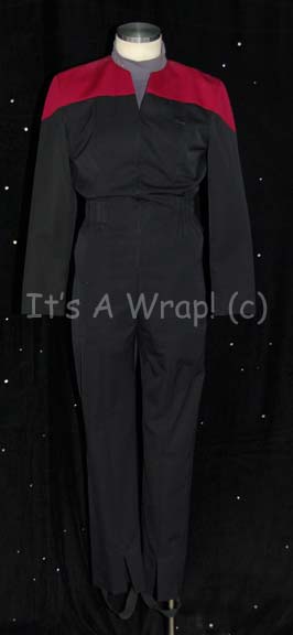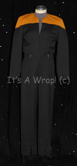 An unfinished Starfleet uniform like those appearing in episodes of Star Trek: Voyager. The costume is a black jumpsuit with operations gold division shoulders, a front zip, Velcro adjustments at the sleeve cuffs, an unfinished internal belt, an elastic waist, and no ‘away team’ gear loops. The jumpsuit is accompanied … |