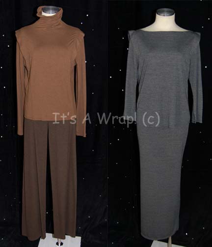 A lot of costume elements like those featured in the Star Trek: Voyager “Workforce” story arc for wear by Kate Mulgrew as “Captain Janeway”. This lot consists of a long-sleeved, brown blouse featuring cuffed accents around the shoulders and corresponding trousers; a charcoal-colored, wide collared blouse of the same style … |