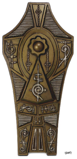 Five Vulcan wall decorations, each painted as aged bronze and adorned with the Vulcan IDIC symbol and Vulcan script, four made from resin and glass fiber castings, the fifth made from vacuum-formed plastic -- <I>72in. high</I> -- showing wear from use on several different sets; accompanied by a set dressing … |