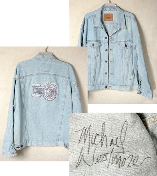 Pale blue denim crew jacket, size XL Large, with a large image of the U.S.S.Enterprise embroidered on the back. Made by Levi Strauss & Co. Fine condition. Make-up artist Michael Westmore signed in black marker on the inside right side. The U.S. Enterprise (NCC-701) was the original starship. Personal property … |