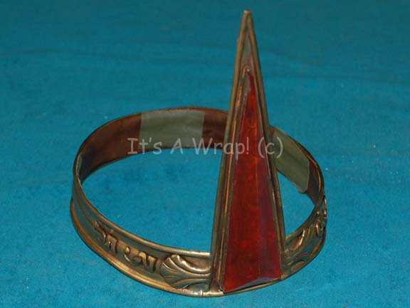 A Vulcan costume headband believed to have appeared in scenes taking place during Star Trek III: The Search for Spock. The item is a fashioned metal headband with a large triangular accent in the front that houses a large red ‘gemstone’. The band also features four differing instances of Vulcan … |