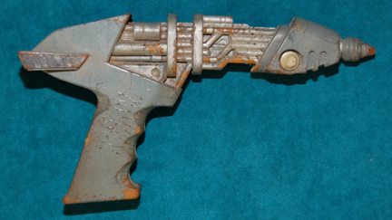 A recurring alien energy pistol prop like those appearing variously in Star Trek episodic television. The item is made from sturdy molded rubber fashioned after the Jem’Hadar pistol. It features metallic silver painted molded accents to suggest hardware, and gray painted covered areas. The paint depicts cracking and has rubbed … |