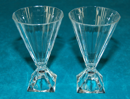 A pair of tall table glasses like those used by “Severn of Nine” (Jeri Ryan) and “The Doctor” (Robert Picardo) in the Star Trek: Voyager episode “Body and Soul”. The items are round lipped with sturdy pyramidal bases, made from clear glass, and measure approx. 6.25 X 3.5 inches diameter. |