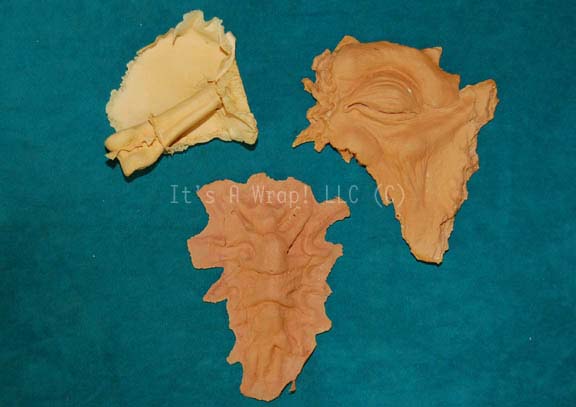 A selection of special effects make-up applications created for episodes of Star Trek: Voyager. The items are molded foam rubber and are cast to represent a section of flesh with a bone extruding from a wound, a flesh covered bone ridge, and a left eye section of a face that … |