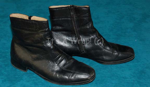 A pair of shiny black leather men’s boots appearing variously in Star Trek: Voyager and possibly reused in other Star Trek episodic television and featuree films. The boots are black leather with tan interior lining and an inside leg zip and clearly used; the soles are slightly worn but in … |