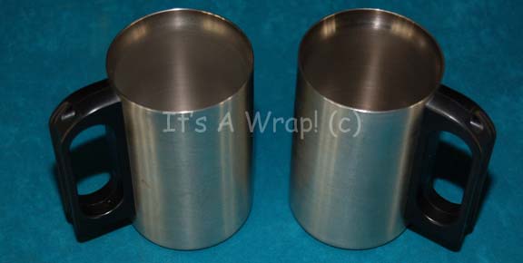 A pair of polished silver colored metal drinking mugs like those appearing in the Star Trek: Voyager episode “Night” during a scene where “Tom Paris” (Robert Duncan McNeil) drinks from one. These mugs feature a solid black plastic handle and no identifying marks. A minimal amount of scuffing is visible … |