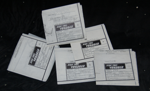 A lot of schematics for sets featured in various episodes of Star Trek: Voyager beginning in the episode “Extreme Risk”. This lot consists of five schematics of what appear to be interiors and consoles for what became the “Delta Flyer” shuttle craft. All items feature Production Number, Episode title, Production … |