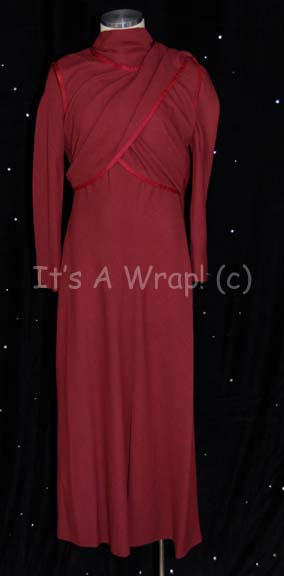 A costume lot featured in the Star Trek: Voyager episode “Lifesigns” for wear by Susan Diol in the role of the Vidiian doctor and brief paramour of the “The Doctor” (Robert Picardo), “Denara Pel”. This costume consists of a long-sleeved, full-length, red dress with a high neckline, a drape of … |