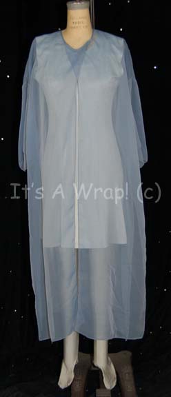 A costume featured in the Star Trek: Voyager episode “Innocence”. This interesting costume consists of an olive-colored jacket featuring sheer black netting sewn onto it with a matching veil over the face; wide sleeves attached to the jacket until the elbow, further sleeves and attached gloves of the same netting, … |