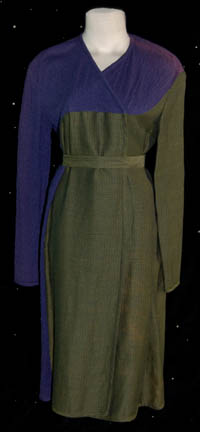 A costume featured in the Star Trek: DS9 episode “Shattered Mirror” for wear by Felicia Bell in her portrayal of “Jennifer Sisko”, wife to the Mirror Universe “Ben Sisko” (Avery Brooks). The costume is a green and purple hospital gown with long sleeves and a matching green belt. The costumer's … |