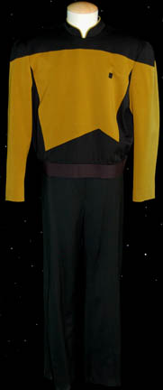 A Starfleet operations gold uniform in the third season style made for wear on the Star Trek: The Next Generation series. The jacket is gold and black with gold trim around the collar. It has a zip and snaps up the back and a small Velcro patch on the front … |