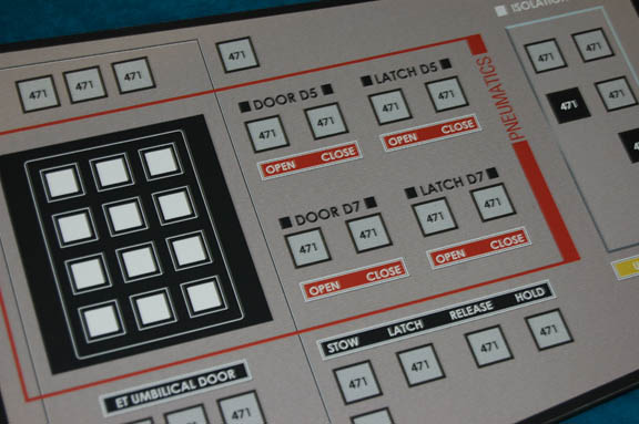 A lot of prop starship consoles similar to those used on the “Enterprise NX-01” and the” NX-Beta” from the episode “First Flight”. These items are paperboard-backed in black, in various shapes, depicting graphics of various ship functions; some small trapezoidal ones appear to be involved with docking procedures, fire suppression … |