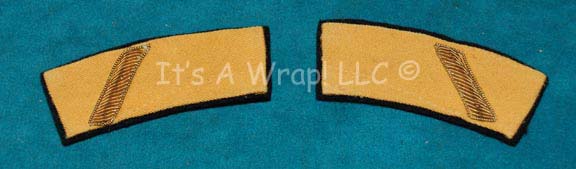 A pair of matching division-rank strips like those appearing in Star Trek I: The Motion Picture on Starfleet officer’s uniforms. The items are black felt backings with yellow colored fabric and gold thread embellishments indicating the wearer to be a ‘lieutenant’. Items like these appeared on the shoulders of class-B, … |