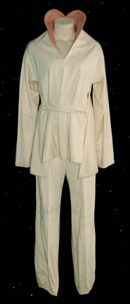 A cream colored tunic for off duty crewmen featured in Star Trek I: The Motion Picture. The tunic features a high, heart-shaped neck, long sleeves, and a waist tie that crosses from the left to the right where it laces through a pair of rings. The costume also comes with … |