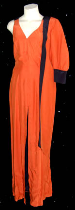 Featured in the Star Trek: Voyager episode “Fortunate Son”, this off the shoulder orange dress has one puffed left sleeve and an additional fabric wing for decoration. A sexy thigh length split is up the right leg revealing the chic black lining. Costume comes complete with costume tag indicating wear … |