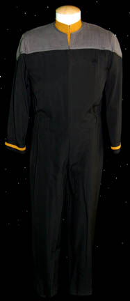 A black Starfleet uniform jumpsuit with gray quilted shoulders and operations gold division strips on the cuffs featured in Star Trek X: Nemesis. The costume also comes with an operations gold division long sleeved zip front undershirt. The costume is intended for male wearers. |