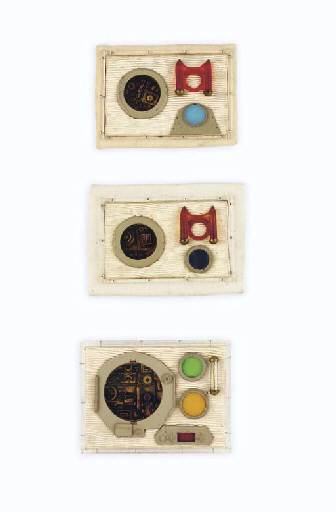 Three rectangular costume badges with plastic, metal and resin parts on a fabric background, all -- made for the Regula One scientists' costumes in <I>Star Trek II: The Wrath of Khan</I>. (3) |