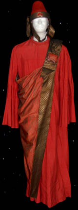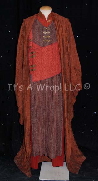 A costume similar to those featured in the various Star Trek feature films. This costume features a long-sleeved, full-length red robe, a metallic-orange colored sash with olive green stripes, a wide gold and brown striped inset with a red “jewel” on it, and gold-colored lining. Included is a Vulcan-style hat … |