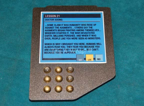 A sturdy PADD (Personal Access Display Device) made from high quality cast resin featured in the episode “Cold Station 12” painted metallic pewter with applied gold painted rubber accent ‘buttons' and an application graphic depicting ‘Lesson 21, Dr. Soong’ and an essay on why ‘augments’ are superior to homo sapiens, … |