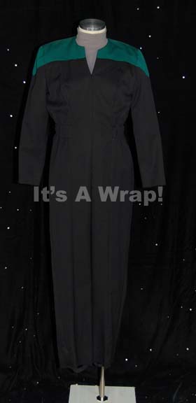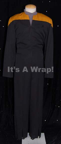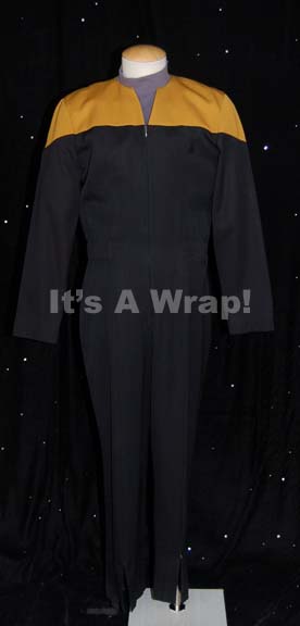 A costume featured in various episodes of Star Trek: Voyager and for wear by David Anderson as the recurring character of ‘Ensign Ashmore”. This costume is a black Starfleet uniform jumpsuit with Operations Gold division shoulders that zips up the front, clasps half way up the chest, and features a … |