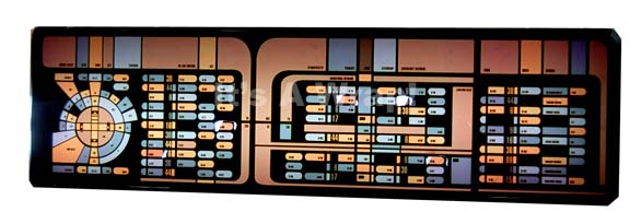 A large sized LCARS style console inset panel like those appearing variously in Star Trek episodic television. The item is a sheet of smoked acrylic with a multi-colored graphical application adhered to the reverse that depict multiple faux buttons, indicators, and readouts with a large attitude and pitch adjustment interface … |
